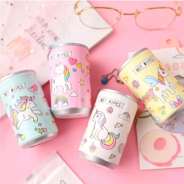 - Mini tin unicorn wet wipes tissue is made of rayon non weaving cloth that is bacteria free